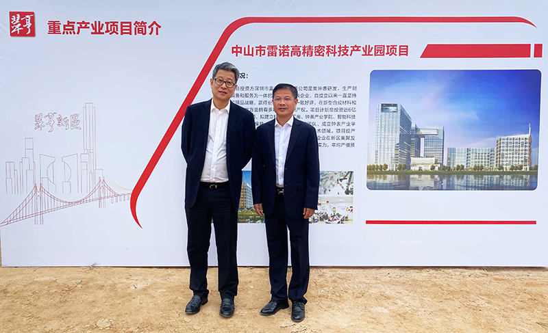 (廣東雷諾精密科技有限公司董事長詹西洲與翠亨新區(qū)管理委員會副主任許行合影留念)